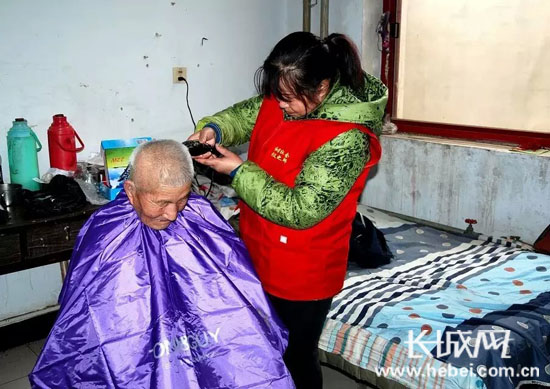 義工高燕和郭田春,這兩位義工一個給老人理發(fā),一個給老人打掃衛(wèi)生,整理床鋪、兩個人忙活的滿臉都被汗水所掩蓋。郭田春說:“看到老人們干凈了,我們再累,心里也是甜的。“