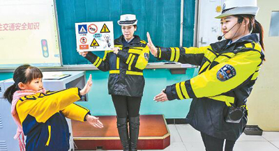 寒假臨近,河北省大廠回族自治縣組織開展“關(guān)注安全?護苗成長”主題教育活動,愛心志愿者組成10余個志愿小分隊分赴大廠中小學(xué)校開展寒假安全知識講座。圖為1月15日交通志愿者向?qū)W生講解交通手勢含義。新華社記者?李曉果攝