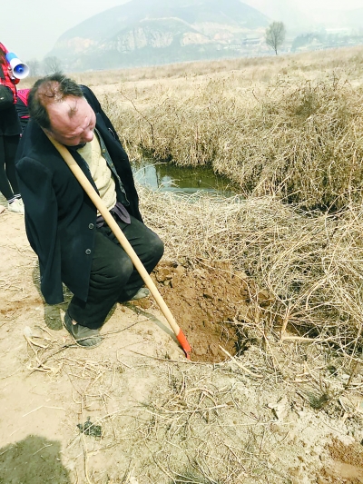 ????賈文其用脖子夾著鐵鍬種樹(shù),然后用腳把樹(shù)苗扶正。 |