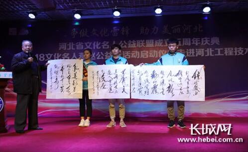 ??? 河北省文化名人公益聯(lián)盟主席邊國政、河北省文化名人聯(lián)誼會會長李禾分別致辭;河北省文化廳原廳長李九元最后作總結(jié)講話;他在講話中充分肯定了河北省文化名人公益聯(lián)盟成立五年來所取得的顯著成績,對此次發(fā)起主辦的“2018文化名人燕趙公益行”活動表示大力支持。他說,這次公益活動的主題很好,文化就要接地氣,文化名人就要深入下去,發(fā)揮自身優(yōu)勢,務(wù)實(shí)地幫助基層單位提升文化內(nèi)涵,助力美麗河北建設(shè),這也是文化名人的擔(dān)當(dāng)和社會責(zé)任。